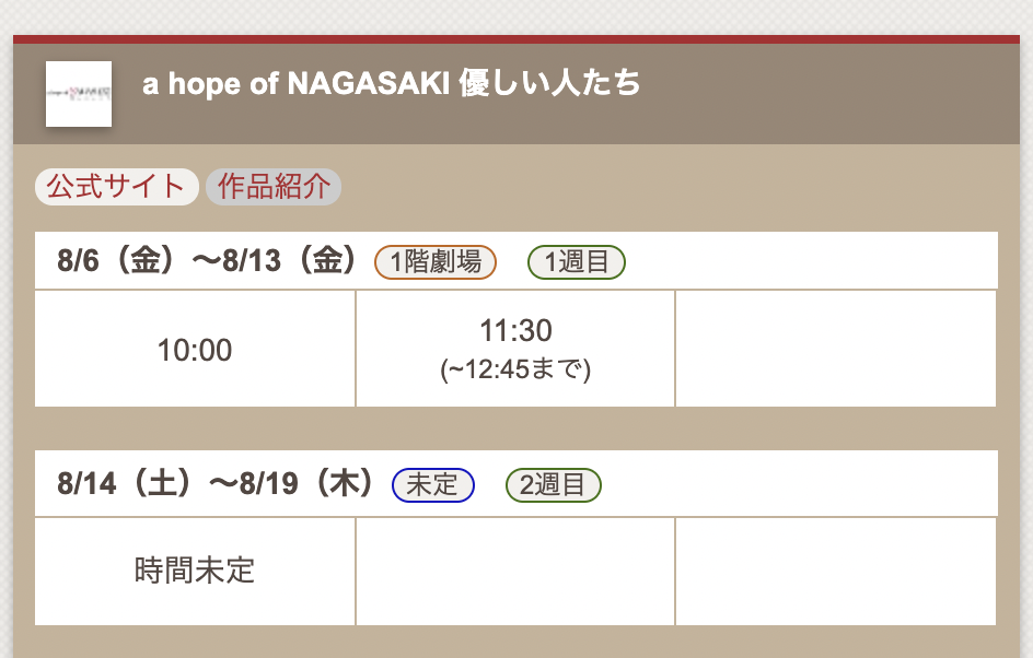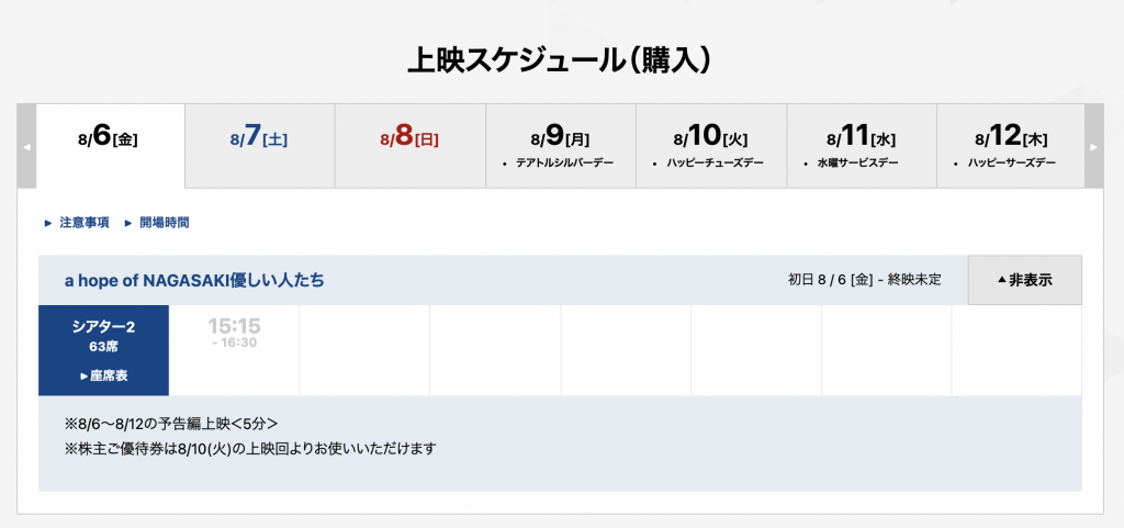 日毎で時間が変更になる可能性もありますので、各劇場HPでご確認ください。