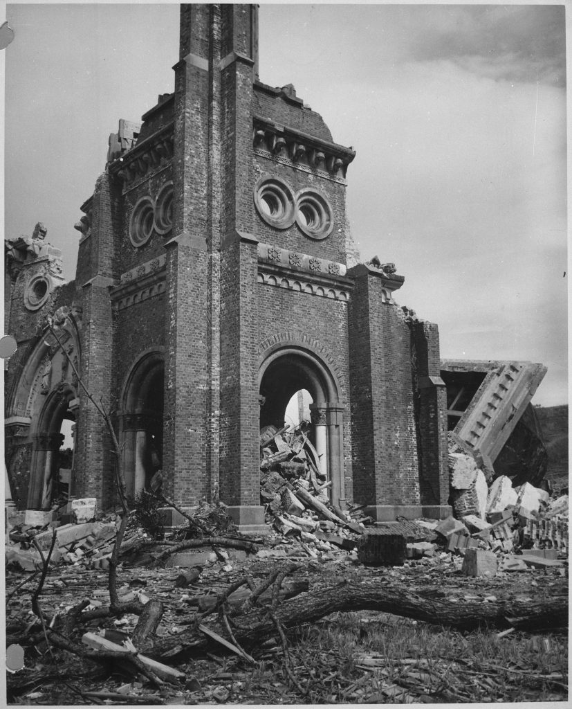 長崎市内には原爆の被害を表す跡地が様々なところにあります。例えば、爆心地から北東に500mほどにあった浦上天主堂(浦上教会)です。1959年に再建されましたが、ドーム状鐘楼の一つが巨大な残骸や熱線で黒く焦げたり、鼻や腕、指がもぎとられたり、頭部を欠いた石像が残されています。