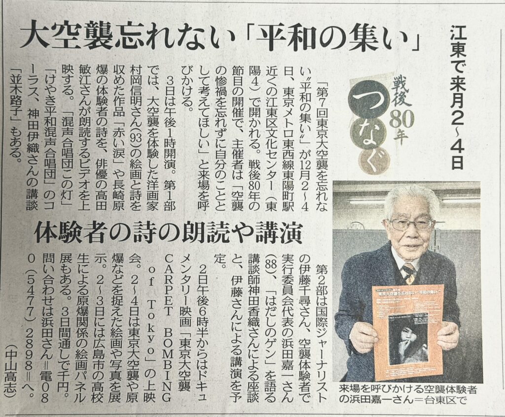 出演された濱田嘉一さんが主催されている「第77回東京大空襲を忘れない”平和の集い”」が12月2〜4日、江東区文化センターで開かれます。その会場で、2日の午後6時30分から上映されます。